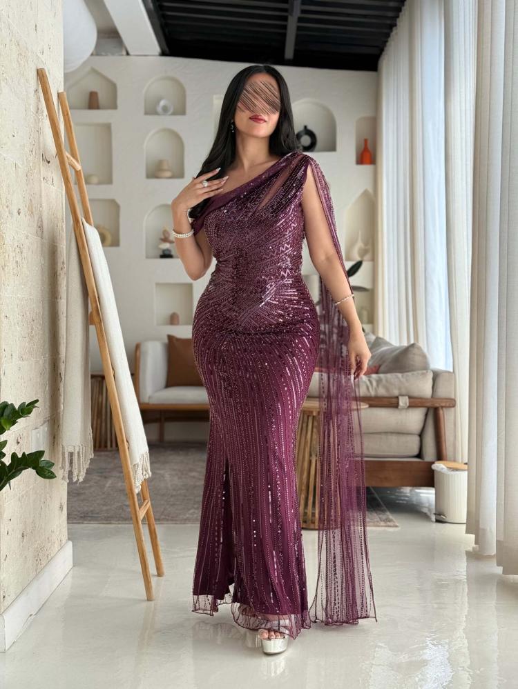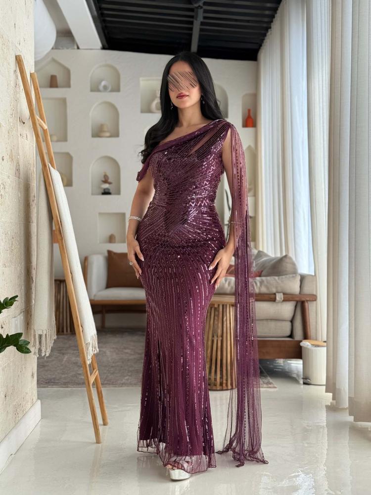 استعدي لتكوني نجمة السهرة مع هذا الفستان الفاخر بلونه البرغندي اللامع وتصميمه المتقن بالتطريز اليدوي من الشك والترتر. يتميز بقصة ضيقة تبرز منحنيات الجسم بشكل أنثوي، مع فتحة جانبية أنيقة تضيف لمسة جريئة، بالإضافة إلى قطعة كاب جانبية شفافة تعطي مظهراً ملكياً استثنائياً. التصميم يجمع بين الفخامة والعصرية، مثالي للحفلات الراقية أو المناسبات الخاصة.