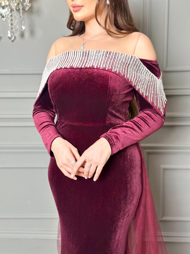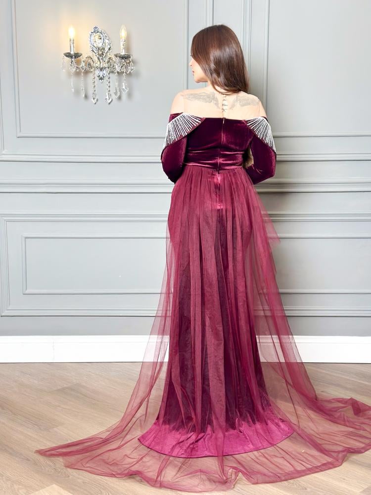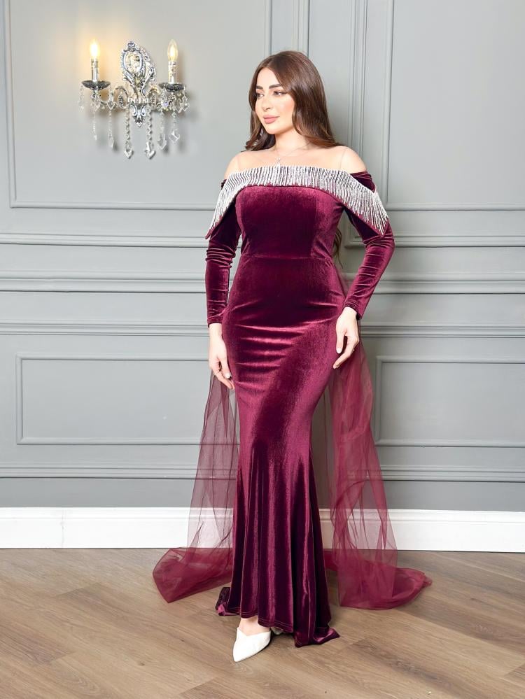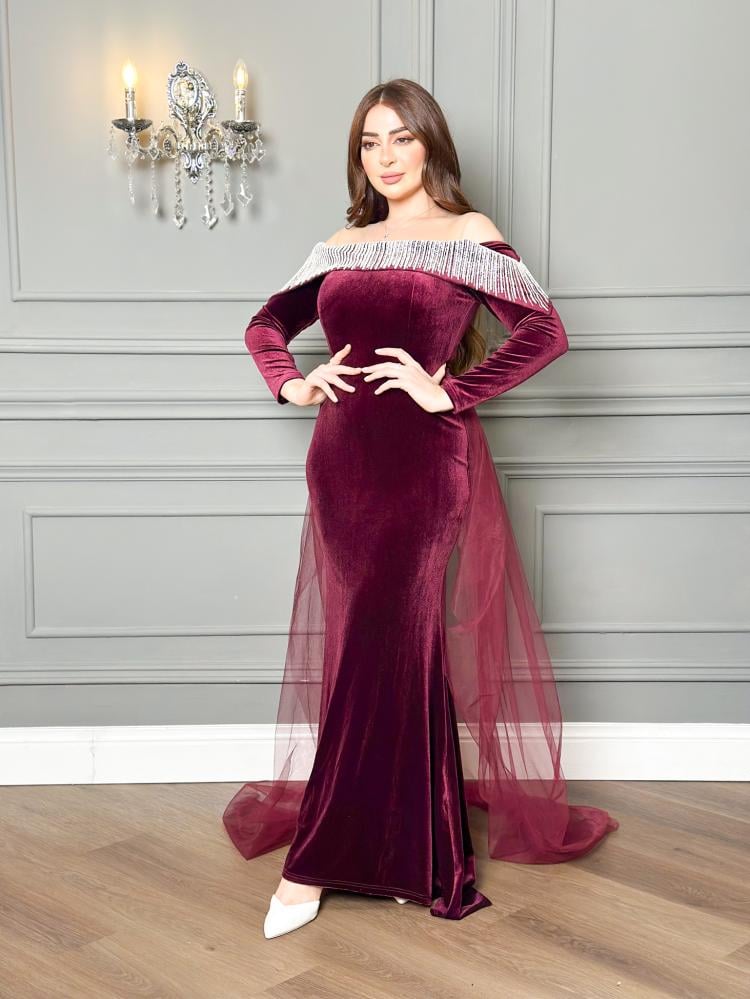 فستان سهرة مخمل فاخر بلون عنابي، مزين بتفاصيل شك يدوي رائعة مع قطعة تل منسدلة لإطلالة ملكية وجذابة.