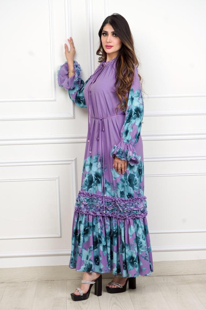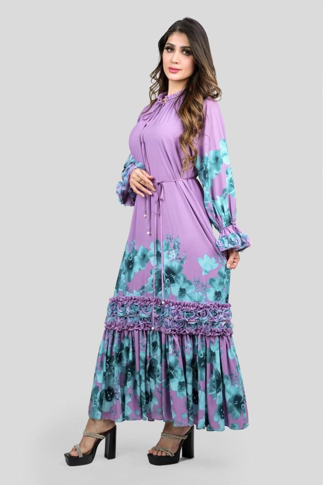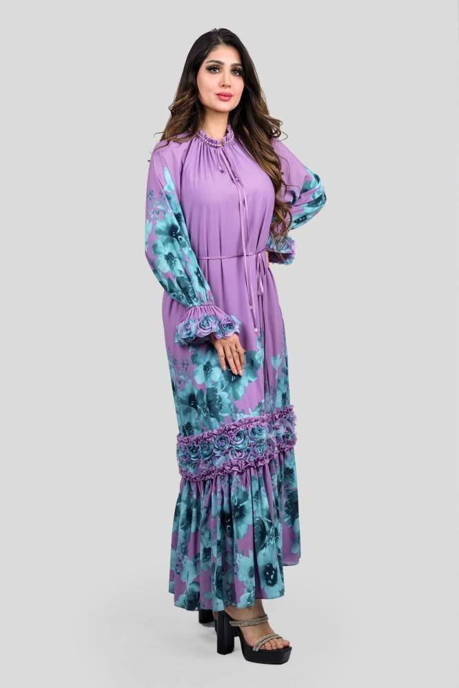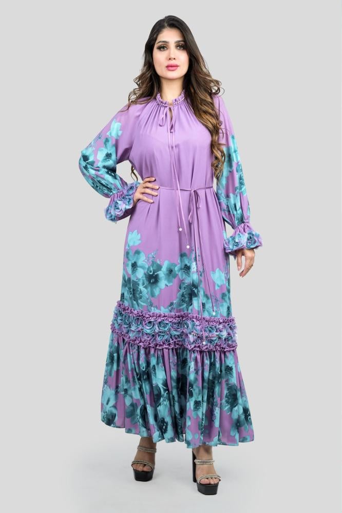 تميزي بإطلالة أنيقة مع هذا الفستان الطويل المصنوع من قماش الشيفون الناعم الذي يمنحك شعوراً بالراحة والانسيابية. يتميز بنقشة زهور أنثوية جذابة وأكمام طويلة واسعة تضيف لمسة من الفخامة. ما يميز هذا التصميم هو الورود ثلاثية الأبعاد والتفاصيل المكشكشة على الأطراف التي تعزز من رونقه الفريد. يمكن ارتداؤه في المناسبات الخاصة والسهرات ليمنحك إطلالة ملكية راقية.