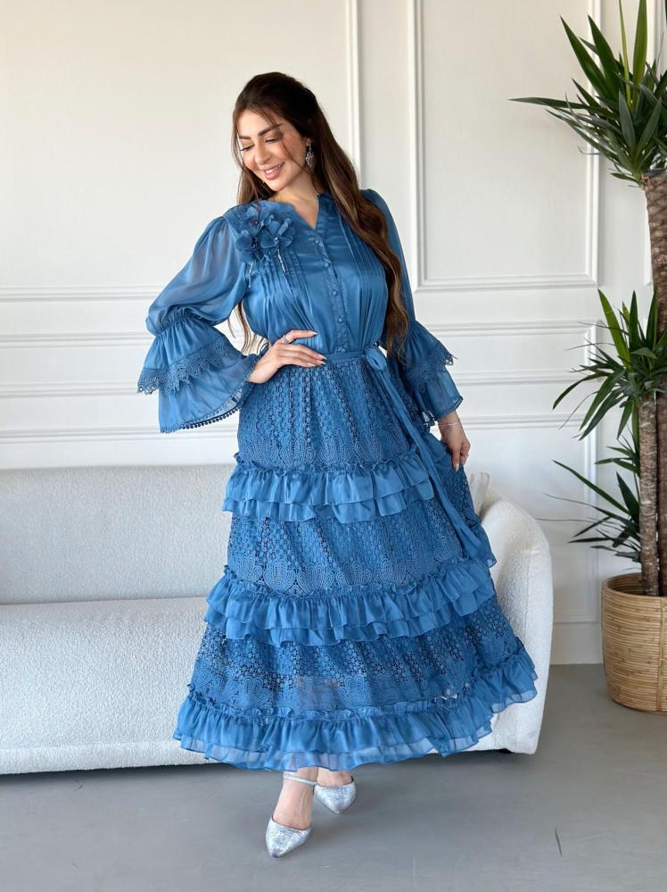 تألقي بفستان شيفون فاخر مزين بطبقات من الدانتيل، يمنحك إطلالة ملكية أنيقة ومثالية لجميع المناسبات.