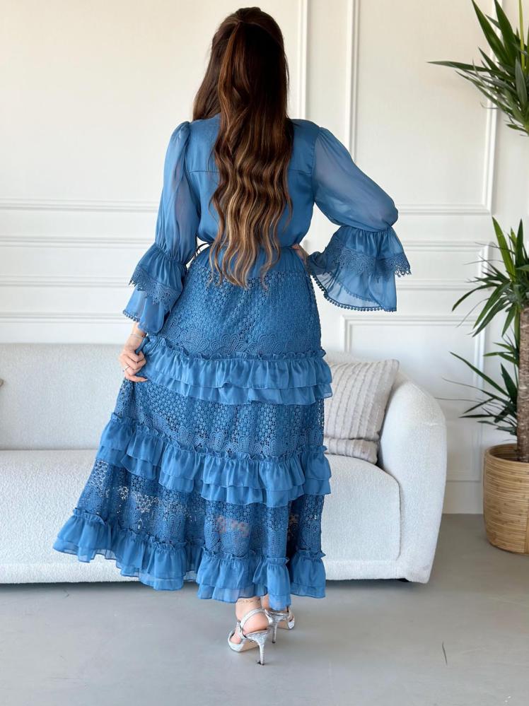 استمتعي بإطلالة ساحرة وأناقة لا مثيل لها مع هذا الفستان المصنوع من الشيفون الفاخر. يتميز الفستان بتصميم رائع يشمل طبقات متداخلة من الدانتيل تضفي لمسة فاخرة وأنثوية على إطلالتك. الأكمام الطويلة والمزينة بتفاصيل دقيقة تضيف لمسة من الرقي والجمال.