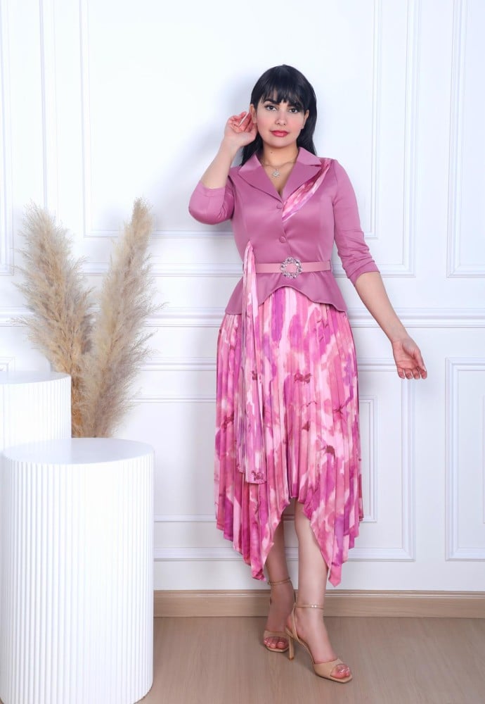 فستان ميدي فكرة جاكت وبلوزة من الاعلى كريب والاسفل بلاسية كسرات مع حزام باكسسوار وقطعة قماش جانبية مائله من البلوزه الى الاسغل