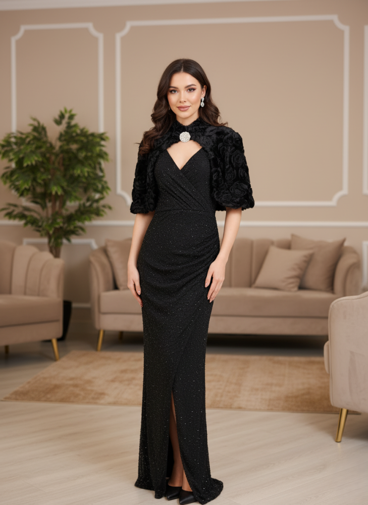 فستان سهرة أسود ملكي وجاكت فرو ناعم