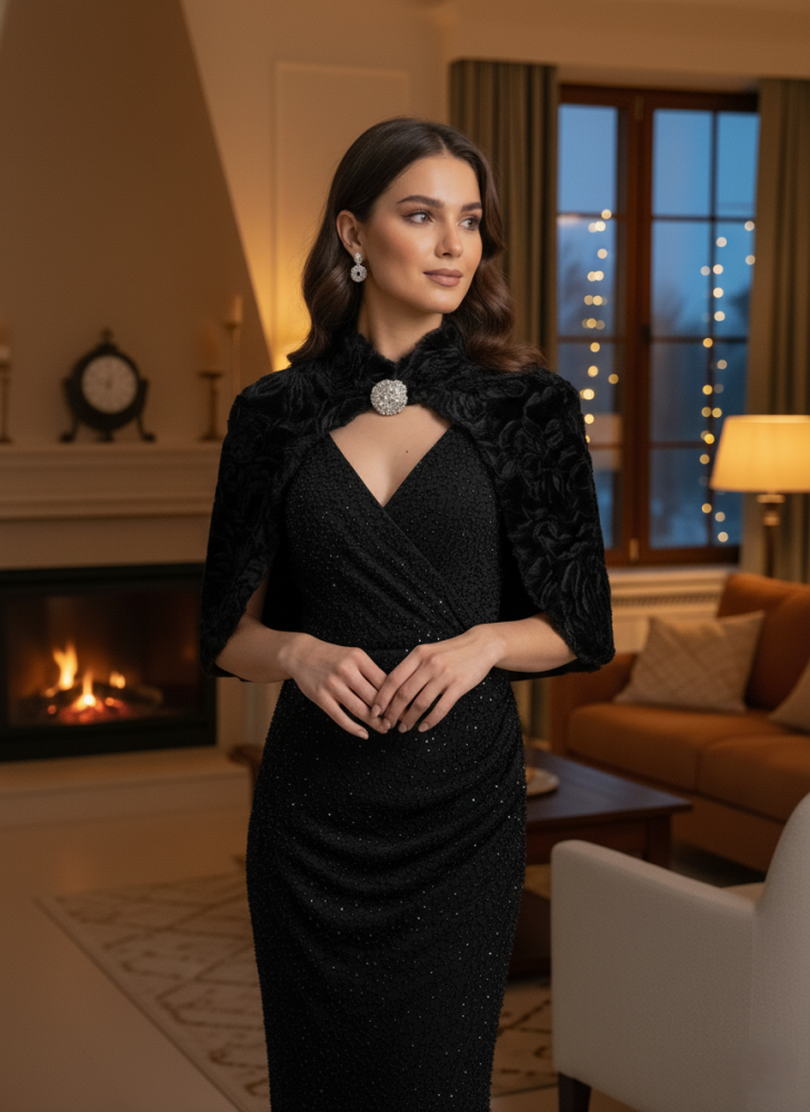 تألّقي بإطلالة تخطف الأنظار مع هذا الفستان الأسود الفخم المصمم ليناسب السهرات الراقية والمناسبات الخاصة. يتميز بقماش لامع فاخر بتصميم انيق يبرز جمال القوام، ويأتي مع جاكيت فرو ناعم بتفاصيل وردية أنيقة تمنحك دفئًا ولمسة من الفخامة. يكتمل التصميم ببروش لامع عند الرقبة يضفي لمسة براقة تزيد من أناقة المظهر. فستان يجمع بين الرقي الكلاسيكي والأنوثة العصرية ليجعل حضورك عنوانًا للأناقة.