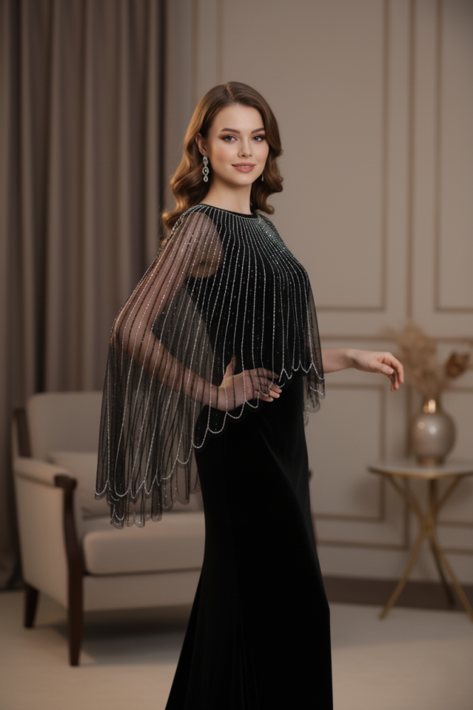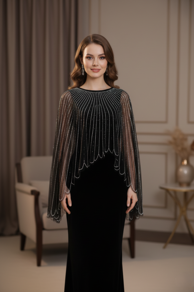 تألّقي بإطلالة فريدة مع هذا الفستان الأسود المخملي الفخم، المصمم بروح راقية تجمع بين الأناقة والكلاسيكية الحديثة. يتميز بأكمام شفافة منسدلة مصنوعة من التول الراقي، مزينة بخيوط ترتر لامعة تضيف بريقًا ناعمًا وحركة انسيابية فاخرة. قصة الفستان المستقيمة تمنح القوام مظهرًا أنثويًا أنيقًا يعكس الذوق الرفيع. اختيار مثالي للسهرات والمناسبات الخاصة التي تتطلّب حضورًا متألقًا وفخمًا.