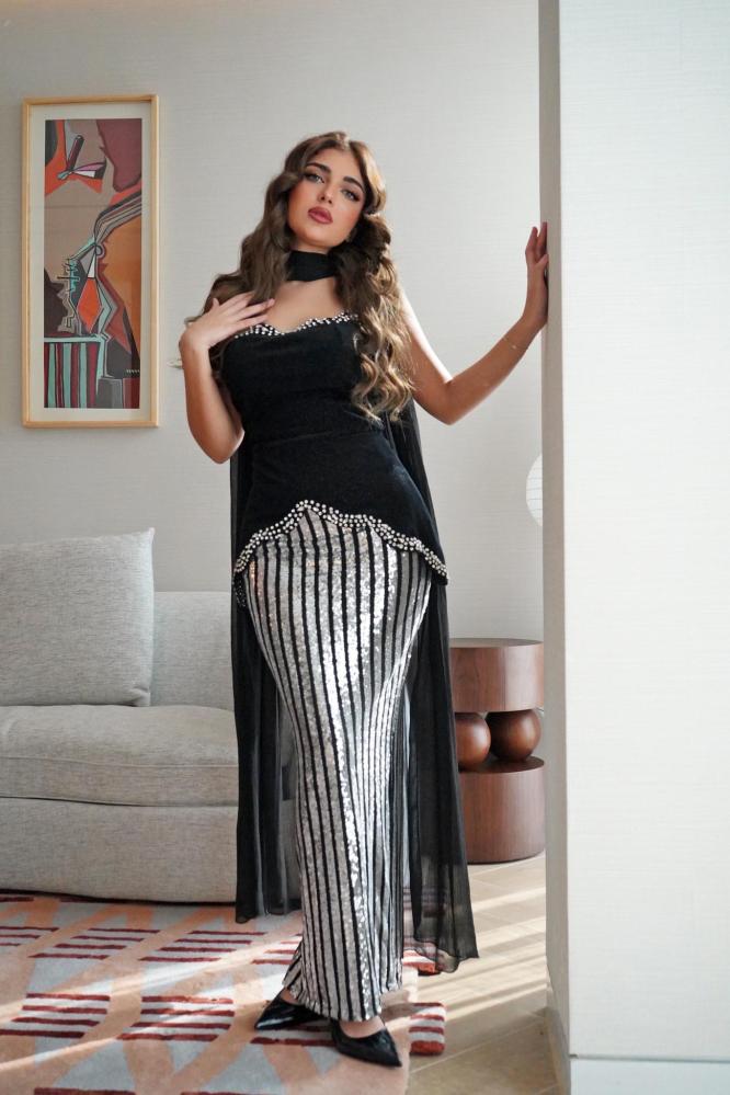تألّقي بإطلالة فخمة لا تُنسى مع هذا الفستان الأسود الفضي الراقي المصمم بقصة ضيقة تبرز القوام بأنوثة وأناقة. يتميز بجزء علوي أسود فاخر مزين بتطريز فضي لامع، ينساب بسلاسة نحو تنورة لامعة بتصميم خطوط عمودية تمنح مظهرًا أطول وأكثر فخامة. الكاب الطويل المنسدل من الأكتاف يضفي حضورًا ملكيًا راقياً يجعل الفستان خيارًا مثاليًا للسهرات الفاخرة وحفلات الزفاف والمناسبات الرسمية.