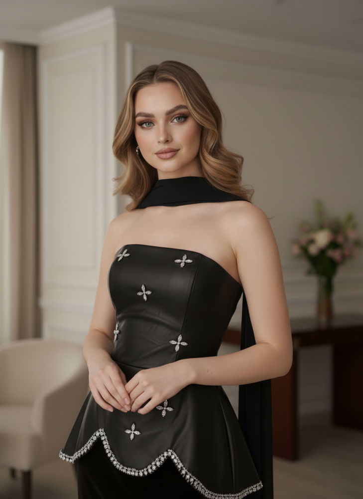 تألّقي بإطلالة تجمع بين الفخامة والجرأة مع هذا الفستان الأسود المخملي الراقي المزيّن بلمسة جلد ناعمة تضيف عمقًا وأناقة للتصميم. يكتمل الفستان بشال انسيابي فاخر يمنح حضورًا ملكيًا جذابًا، فيما يزدان القسم العلوي بتطريز بسيط مرصع كريستال ليزيد من فخامته. تصميمه المستقيم يبرز القوام بانسيابية وأناقة، ليكون خيارك الأمثل للسهرات والمناسبات الفاخرة التي تتطلّب حضورًا لافتًا وأسلوبًا راقيًا.