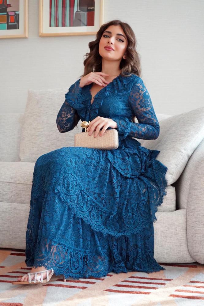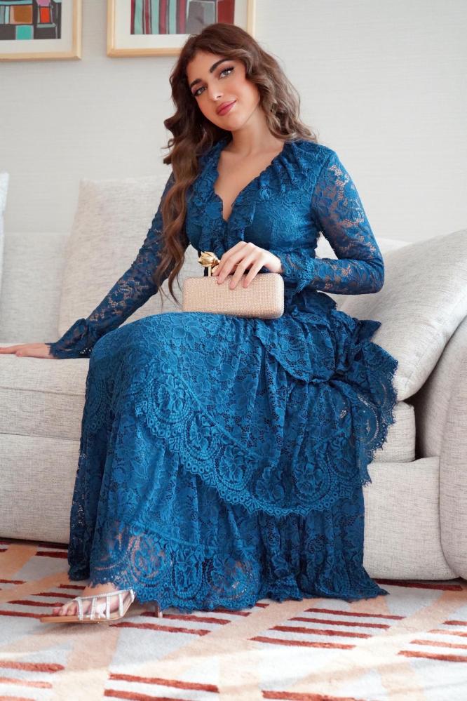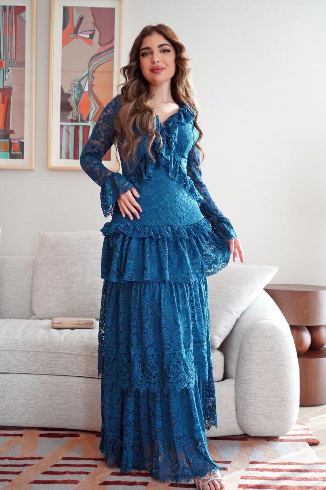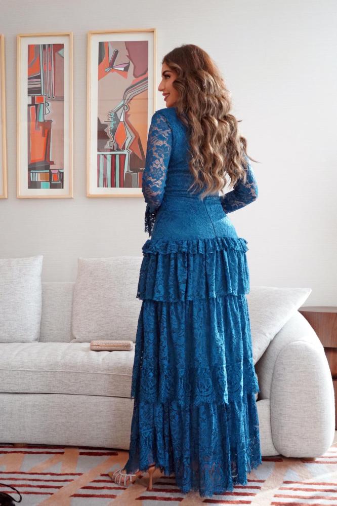 فستان دانتيل أزرق بطبقات وكشكشة أنيقة بتصميم راقٍ