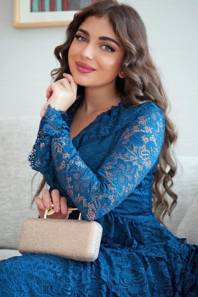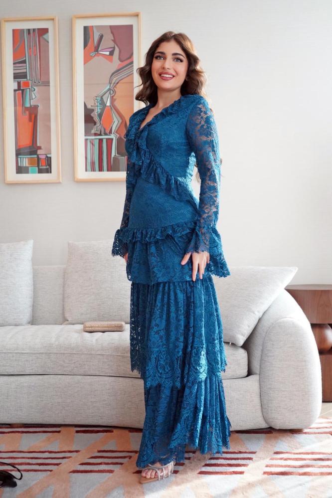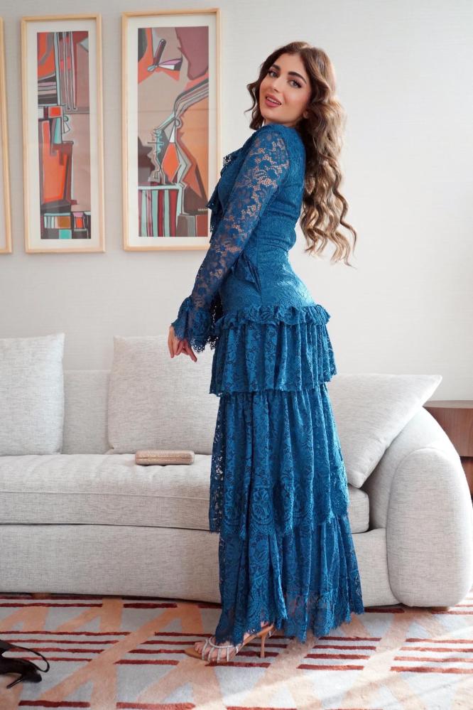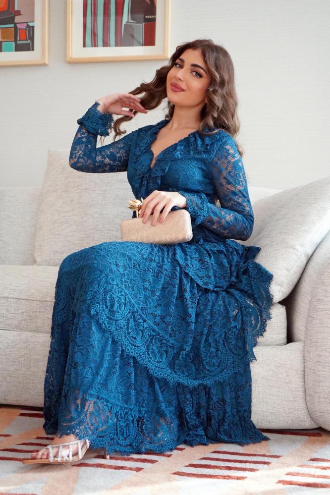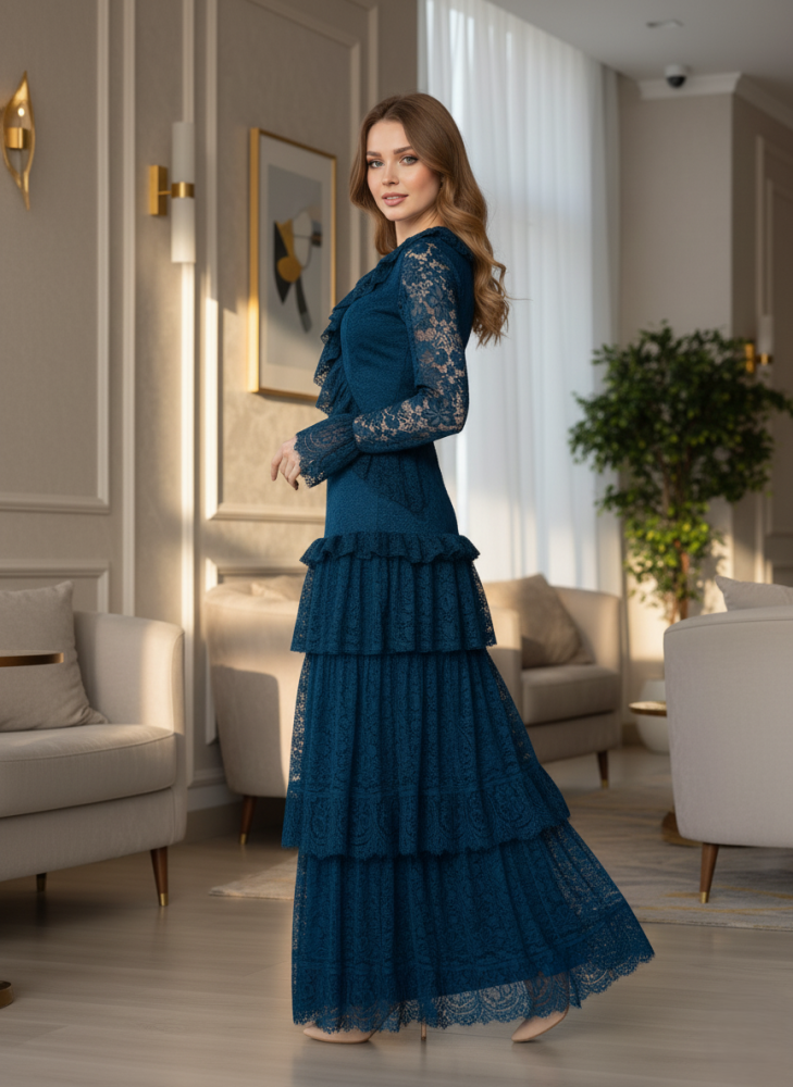 اختاري الأناقة الكلاسيكية مع هذا الفستان المصنوع من الدانتيل الفاخر بدرجة أزرق أنيقة. يتميز بتصميم أنثوي بطبقات متدرجة وكشكشة ناعمة تضفي حركة راقية وجاذبية مميزة. الأكمام الطويلة الشفافة تضيف لمسة من الرقة، فيما تمنح التفاصيل الدقيقة حول الرقبة والأطراف مظهرًا راقيًا يعكس الذوق الرفيع. مثالي للمناسبات الفاخرة وحفلات المساء التي تتطلب حضورًا أنثويًا راقياً.