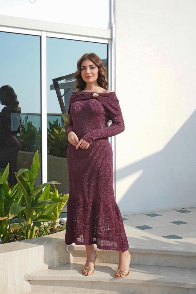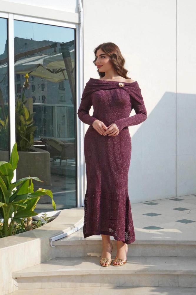 فستان شتوي برغندي بإكسسوار ذهبي فاخر