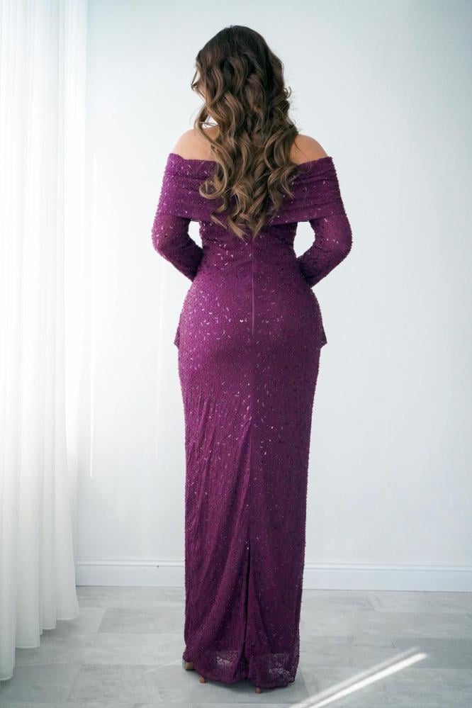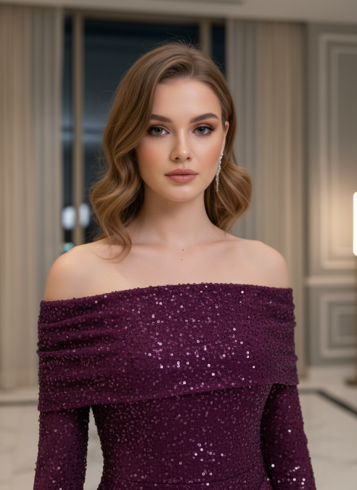 فستان سهرة برغندي أوف شولدر بتفاصيل لامعة أنيقة