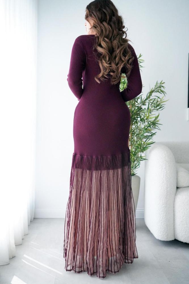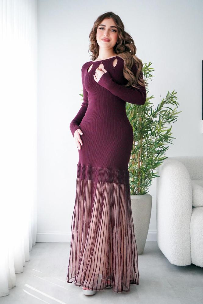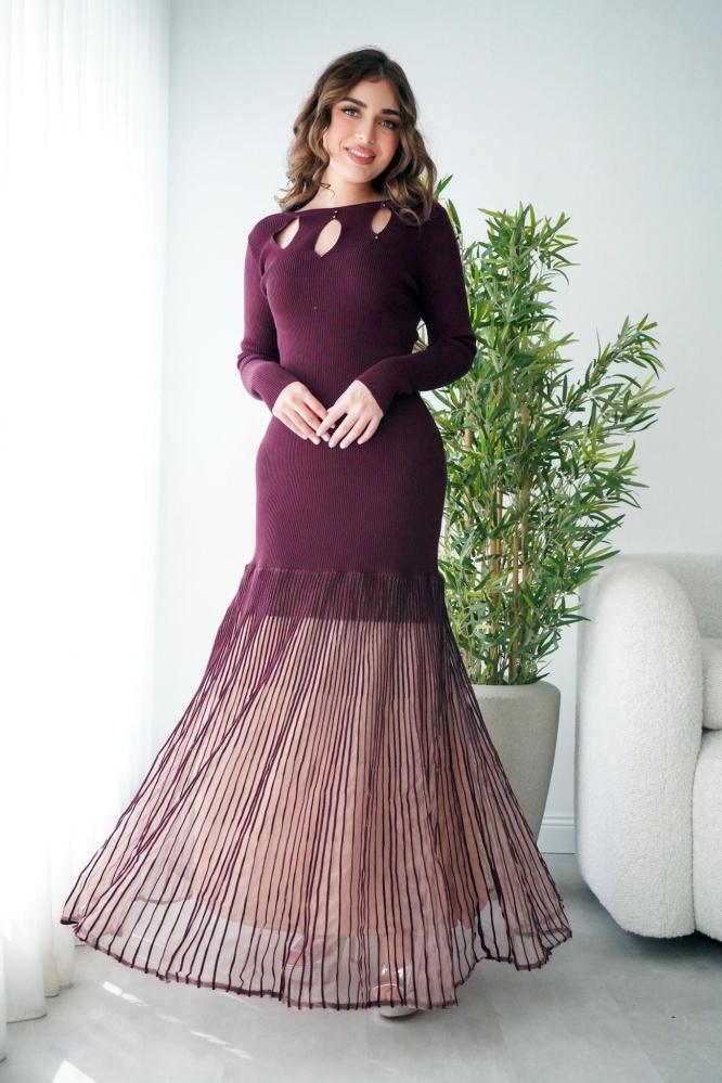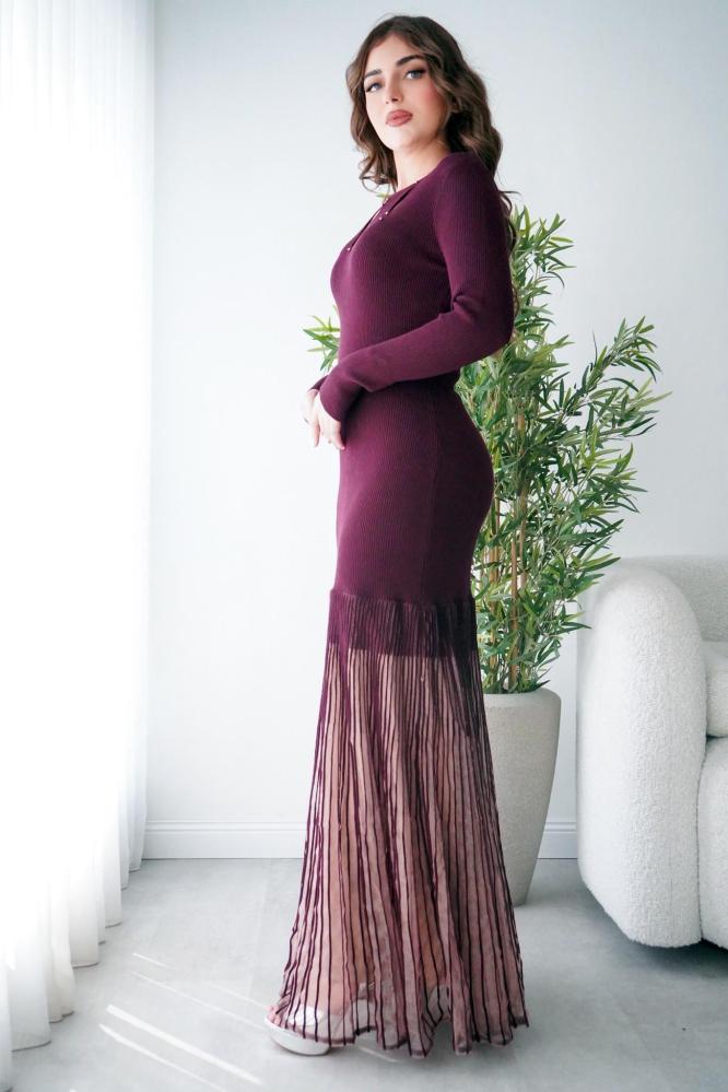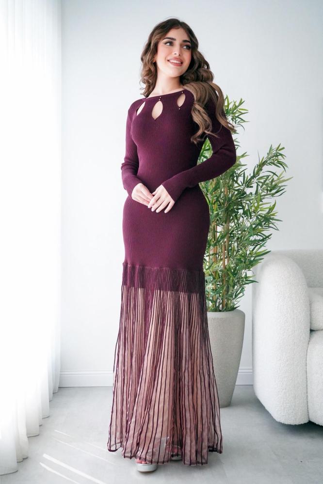 فستان شتوي عنابي أنيق بتصميم انيق وتفاصيل بليسيه شفافة