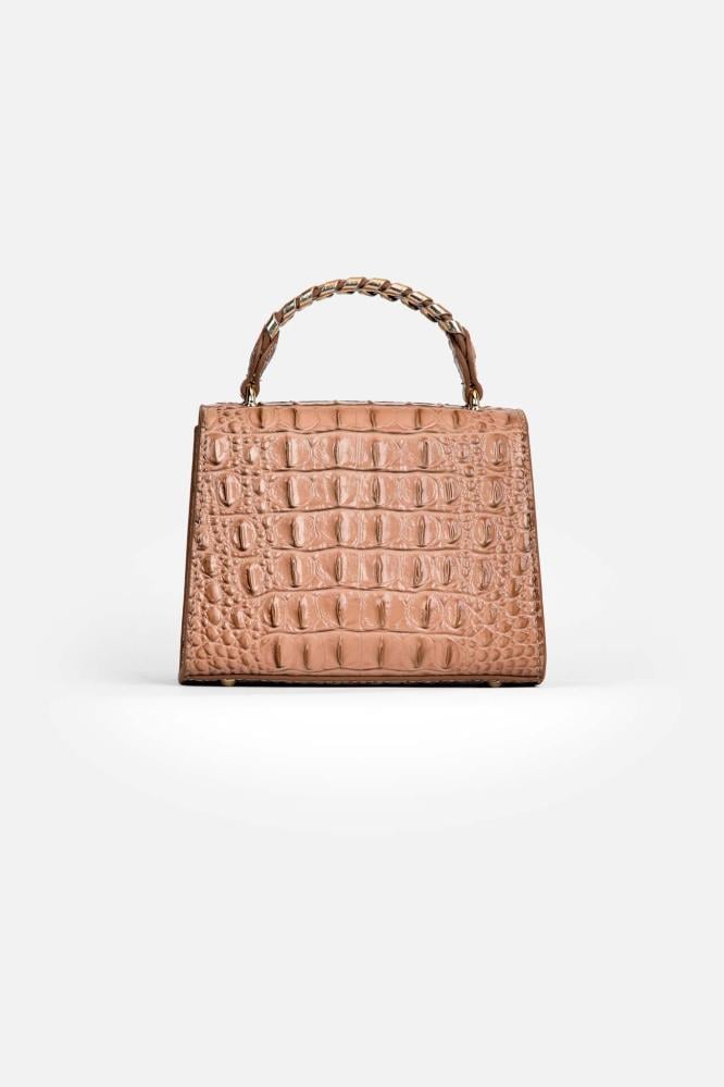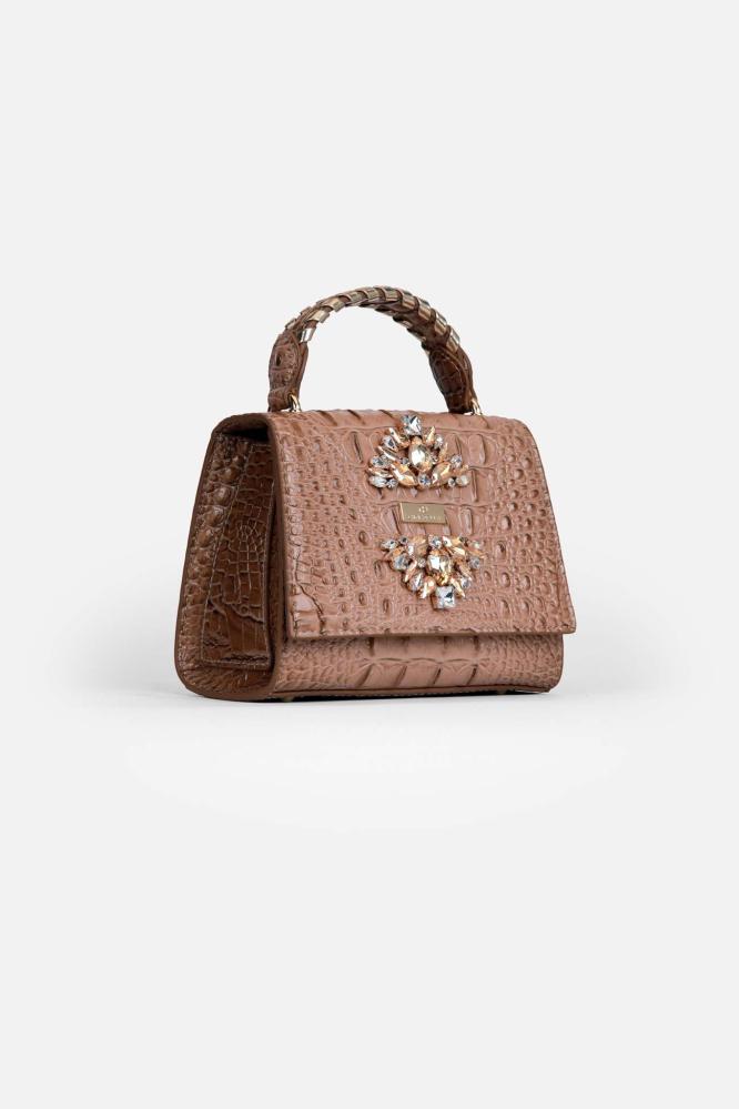 أضيفي لمسة درامية أنيقة لإطلالتك مع شنطة كريسبلا المميزة بلونها البيج الزمردي الفاخر. تأتي بتصميم عصري يجمع بين الفخامة والجاذبية، مع جلد تمساح لامع وقطعة زخرفية أمامية مرصعة بأحجار براقة بألوان البيج والفضي، تعكس الذوق الرفيع.