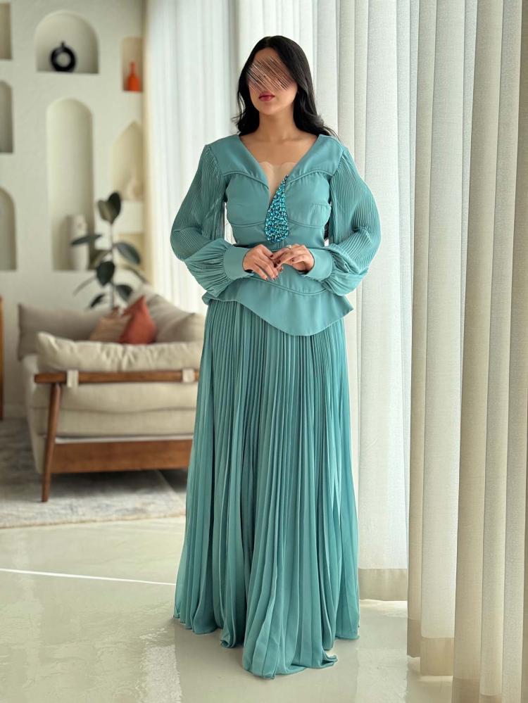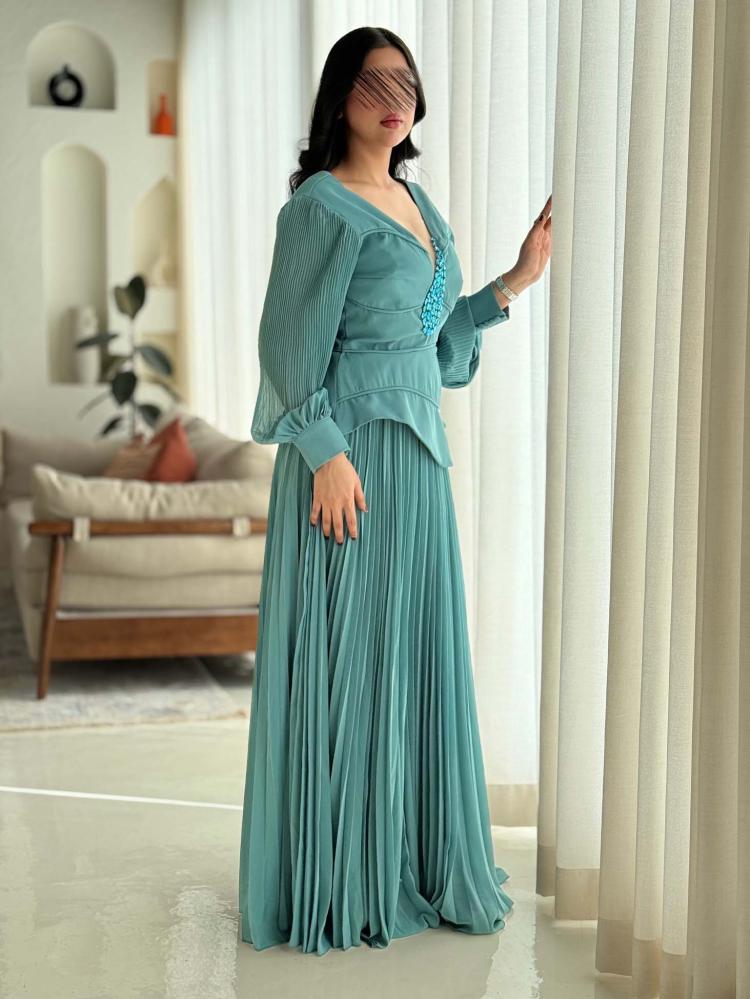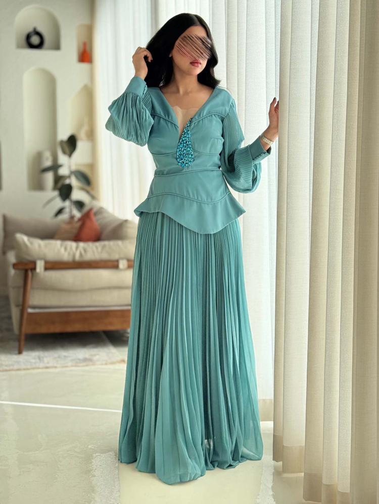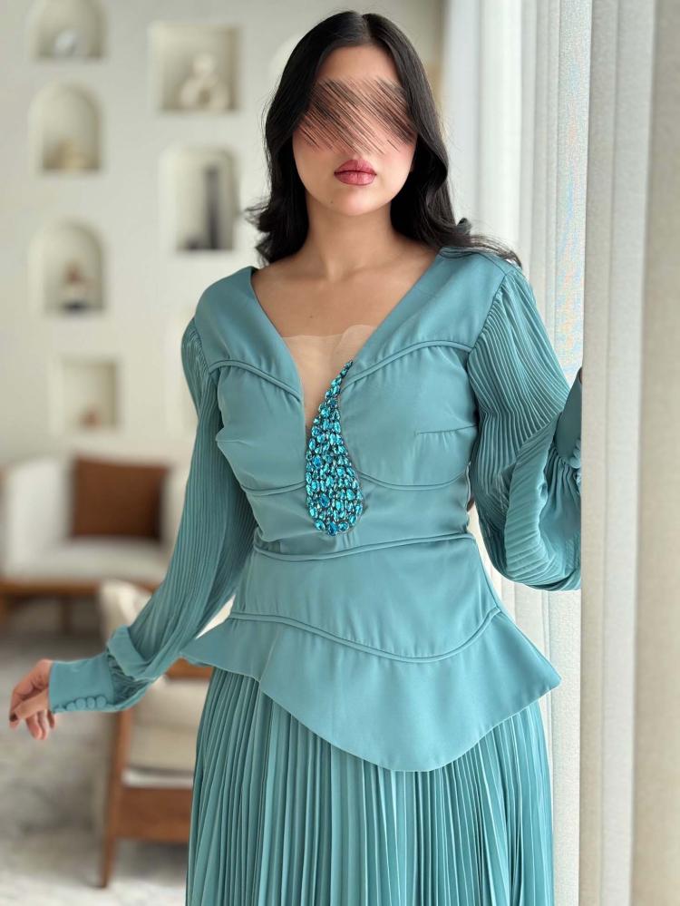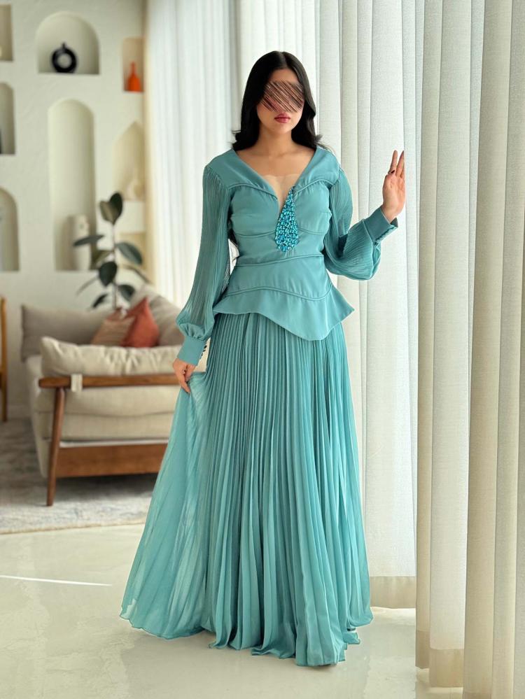 فستان سهرة لون تيفاني راقي بتصميم ناعم وتطريز لامع