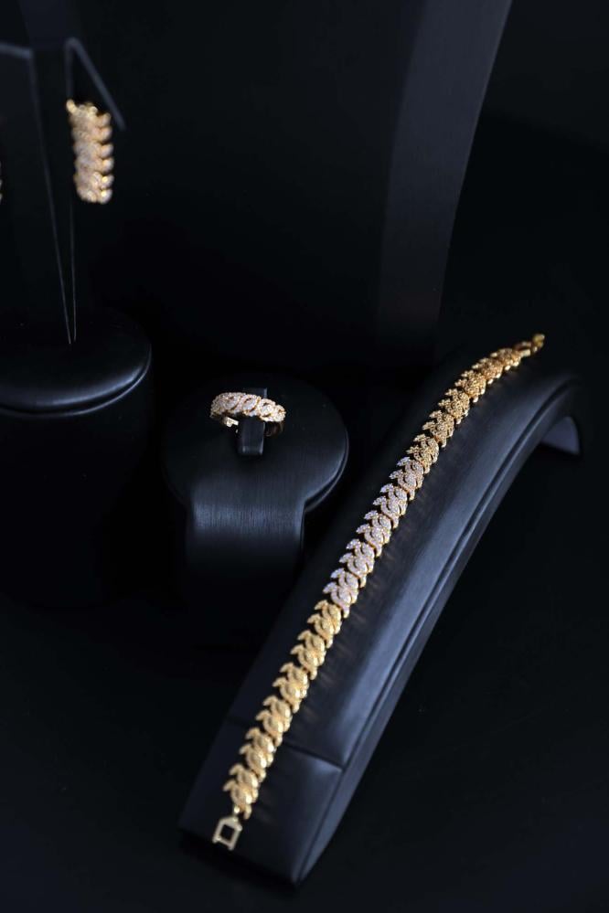 كوني محطّ الأنظار بكل أناقة وثقة مع هذا الطقم الذهبي الفاخر. بمجرد ارتدائه، ستشعرين بلمسة من الفخامة الملكية تلامسك وتمنحك حضوراً متألّقاً لا يُنسى.