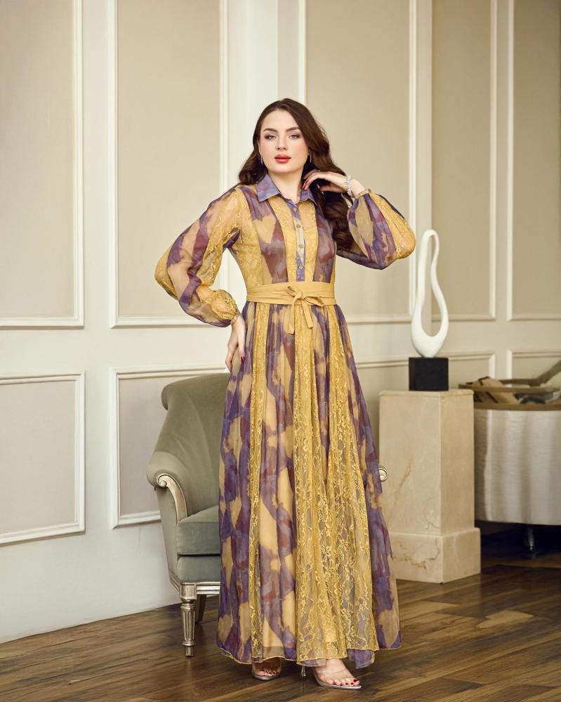 يأتي التصميم بحزام ناعم عند الخصر يبرز القوام بشكل أنيق ويمنح توازنًا مثاليًا للإطلالة، بينما تضيف القصة الطويلة والانسيابية إحساسًا بالفخامة يناسب المناسبات الخاصة والسهرات الراقية.