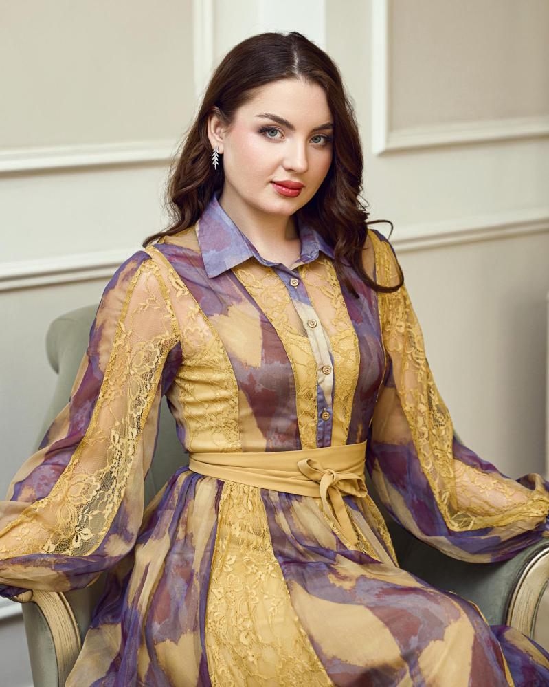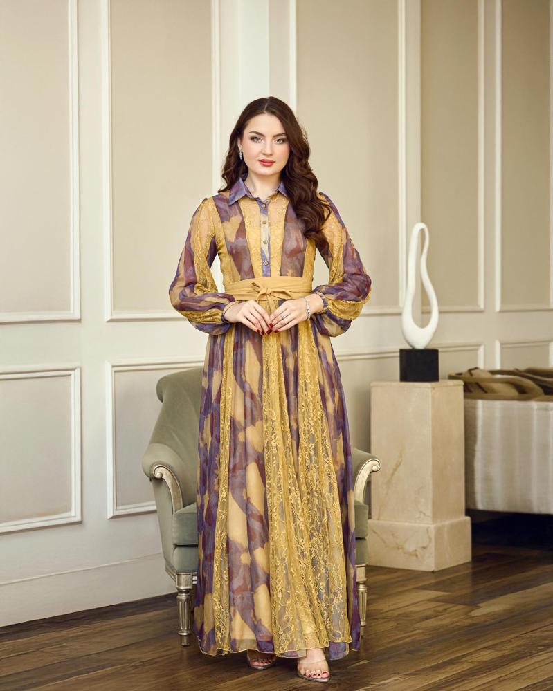 يتميز الفستان بتفاصيل دانتيل أنيقة تمتد بشكل طولي تضيف عمقًا بصريًا ولمسة فخمة، مع أكمام طويلة شفافة تعكس الرقي والاحتشام بأسلوب عصري.