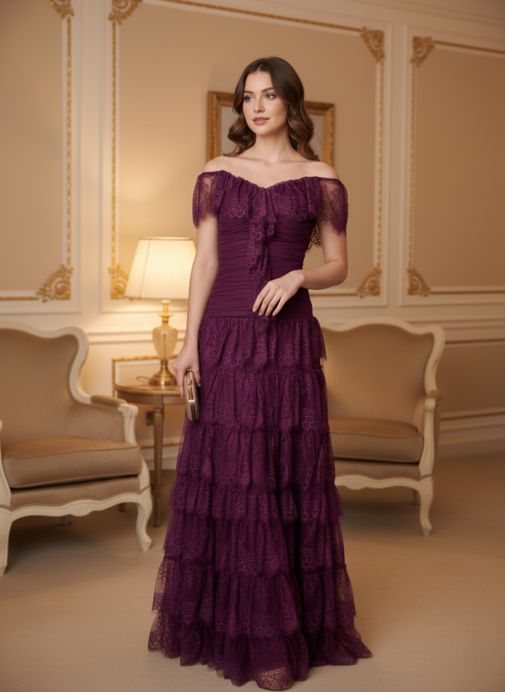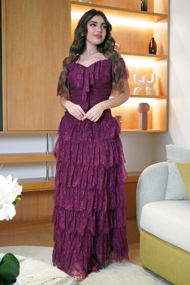 فستان ساحر يجمع بين الرقي والأنوثة بتصميم أوف شولدر يكشف الكتفين برقة، مصنوع من قماش دانتيل فاخر بلون بنفسجي غني يعكس الجمال الكلاسيكي بأسلوب عصري. يتميّز بطبقات دانتيل متدرجة تمنح الحركة انسيابية ناعمة ومظهراً متألقاً في كل خطوة. قصة الخصر الضيقة تبرز القوام الأنثوي بإطلالة مثالية تناسب المناسبات الراقية والسهرات الخاصة.