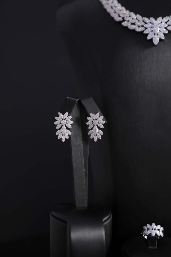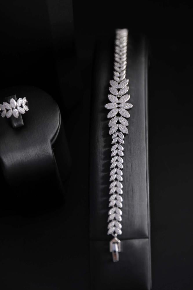 تألّقي بإطلالة ملوكية لا مثيل لها مع هذا الطقم الفضي المصمم بتدرجات ناعمة من الزركون على شكل أوراق مترابطة تنبض بالأناقة.