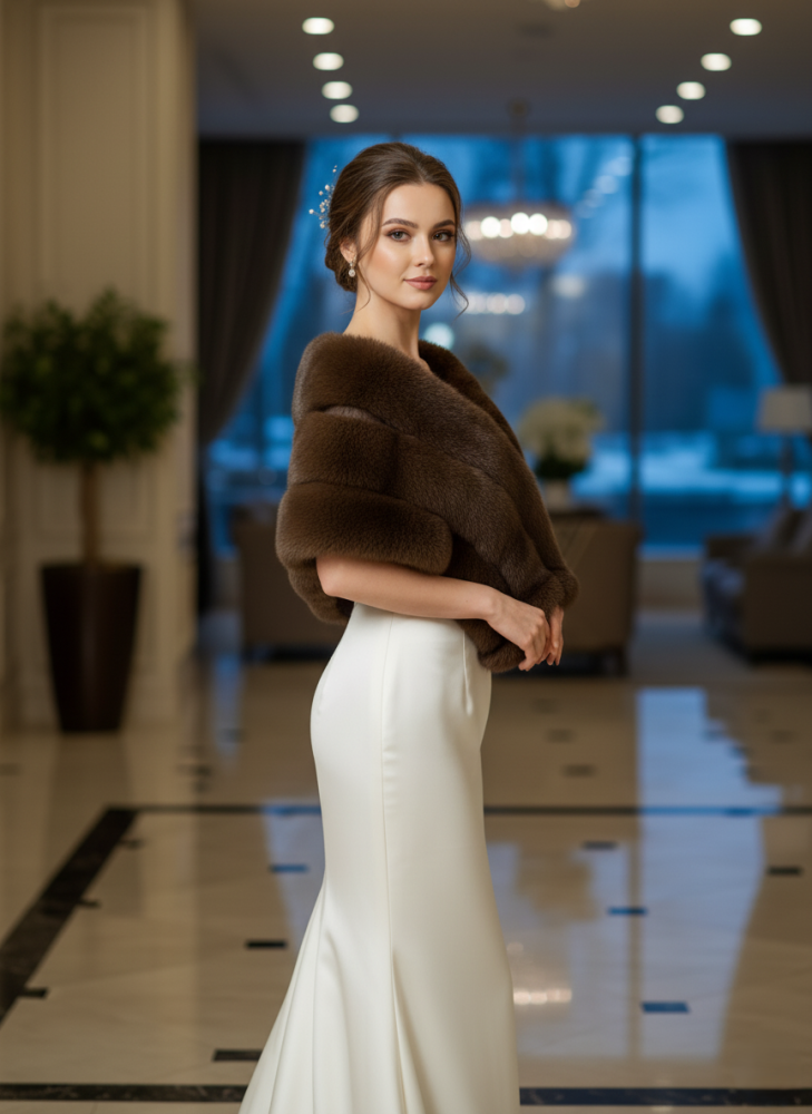 فرو أنثوي راقٍ بلون بني دافئ يجمع بين الفخامة والراحة، مصنوع من خامة ناعمة بملمس فاخر يمنحك إحساس الدفء والأناقة في آن واحد. يتميّز بتصميم draped يلتف برقة حول الكتفين ليكمل إطلالتك بأسلوب ملكي، وتزيّنه لمسة فريدة من البريق عبر بروش كريستالي أنيق يعكس الضوء بأناقة. مثالي للتنسيق مع فساتين السهرة أو فساتين الزفاف في الأجواء الباردة.