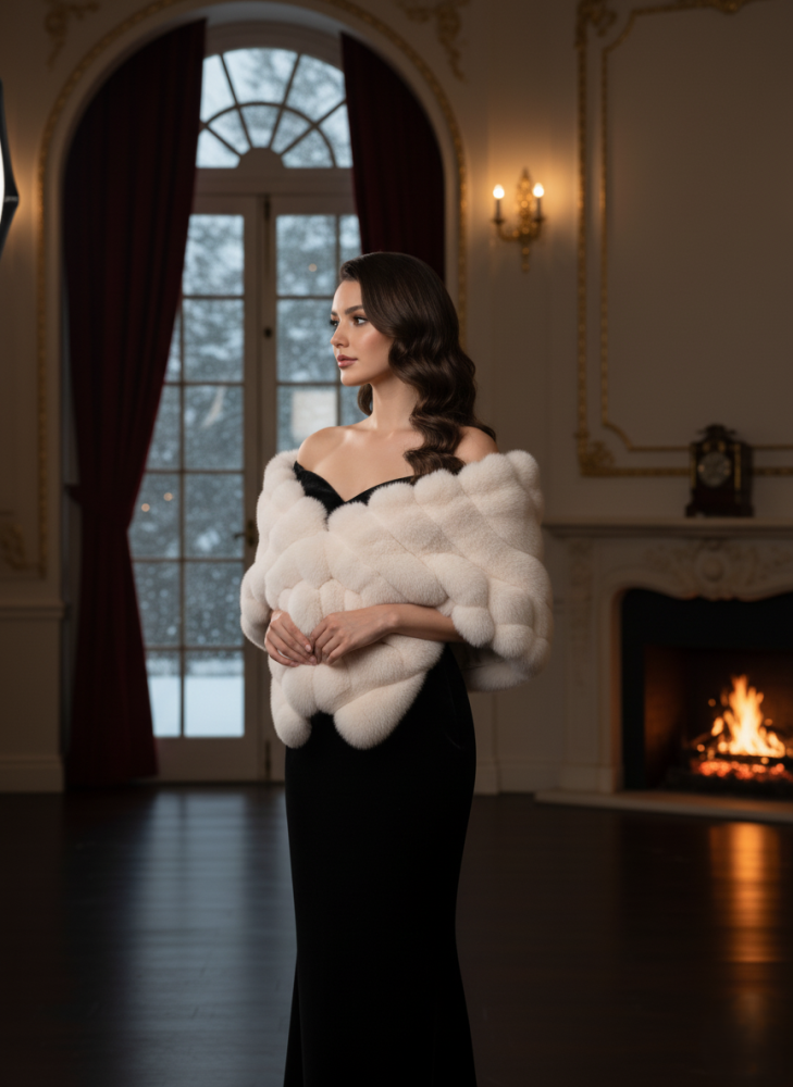 قطعة فاخرة تجمع بين الأناقة الكلاسيكية والدفء العصري، مصنوعة من فرو أبيض ناعم يمنح إحساساً بالترف والرقة في آن واحد. تصميمه الفاخر يلتف بانسيابية حول الكتفين ليكمّل إطلالة السهرة بأسلوب راقٍ يعكس فخامة التفاصيل. مثالي للتنسيق مع الفساتين السوداء أو التصاميم الرسمية في الأجواء الباردة، ليمنحك حضوراً متألّقاً يفيض أنوثة وأناقة.